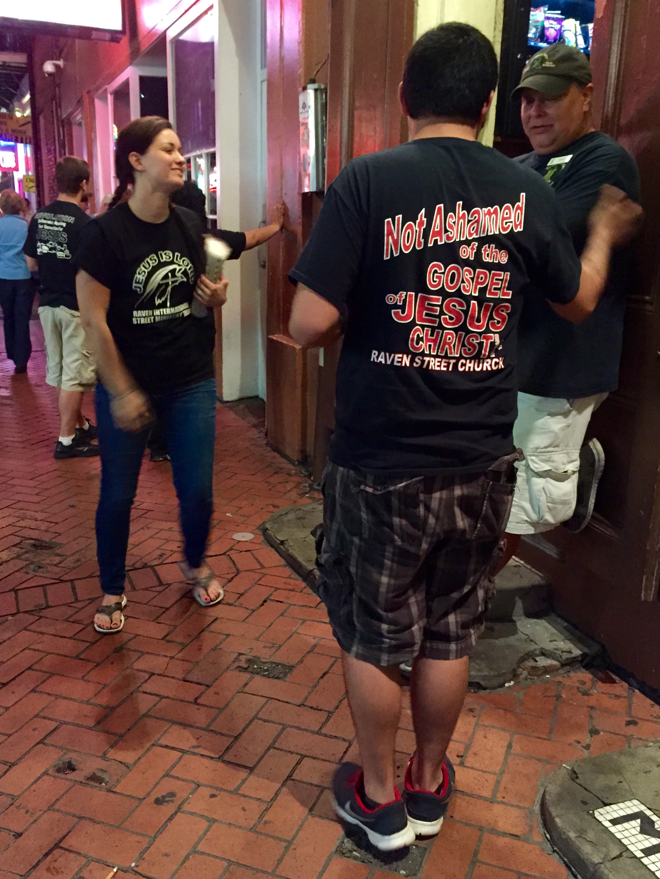 It’s getting late and I haven’t had lunch or dinner, so I look for a place to eat. Night has fallen by the time I leave the restaurant. My walk back to the hotel takes me through Bourbon Street, and what an experience that is. People, people, and more people, walking, laughing, drinking, having a good time. It’s exciting, it’s what the French Quarter is all about. And it’s also a little strange for me, I feel a little lost. These are profane spaces, what am I doing here? My answer comes moments later when I notice a man and a woman praying over a bar tender on the sidewalk. They each have Bibles in their hands and they are wearing t-shirts with Christian slogans, “Ask me how Jesus can change your life,” “Not ashamed of the Gospel of Jesus Christ.” I wait around for them to finish praying and I approach them. “Are you with a church?” I ask. “Yes,” the man replies. He goes on to explain that they are here just about every night, expecially on the weekends, and they go around praying for the workers on Bourbon Street. He is very warm and genuine, there isn’t an ounce of judgment in his words. I look around and see nothing but the kind of environment an Evangelical Christian would typically stay as far away from as possible. “It must be very difficult to do the work you do here,” I say. “Not really,” the woman affirms. The man (I didn’t get their names) tells me ther rarely experience rejection or confrontation. In fact, he tells me, it is quite often the case that people accept Jesus Christ as their Savior right here on these sidewalks. “That’s pretty amazing,” I say. “You see,” he tells me, “When you are in a very dark place, all you need is a match to light the way. And we don’t have a match, we have the most powerful light of the Gospel of Jesus Christ.”