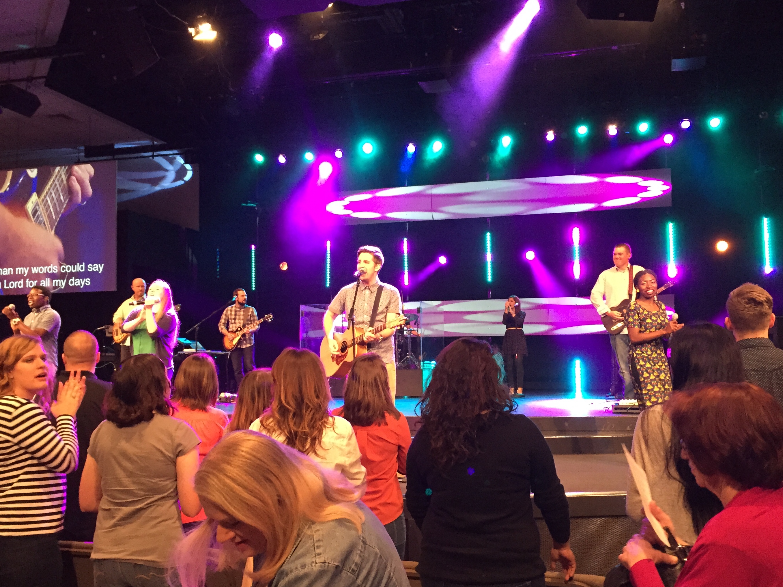 My “worship experience,” as the church refers to its services, was a deep contrast with all of the historic churches and cathedrals I’ve visited lately. You won’t find sacred art in this church. You won’t see an organ or a choir loft. In fact, there isn’t even a pulpit. Instead of pews, there are comfy chairs. Instead of stained-glass windows, there are two giant projection screens flanking the stage. In place of an altar, there are bright, colorful lights and laser visualizations. As you walk in, you can’t help but notice the TV cameras hoisted upon large cranes. An outsider like myself can be easily distracted, even put off, by all of the cutting edge-technology and the exacting level of audio-visual production. But as the service begins and as I look around, the congregants don’t even seem to notice it. They are absorbed in worship, focused on what they have come here to do. To me, this resembles a sound stage for American Idol much more than it does a church. Only the music is better. A lot better.