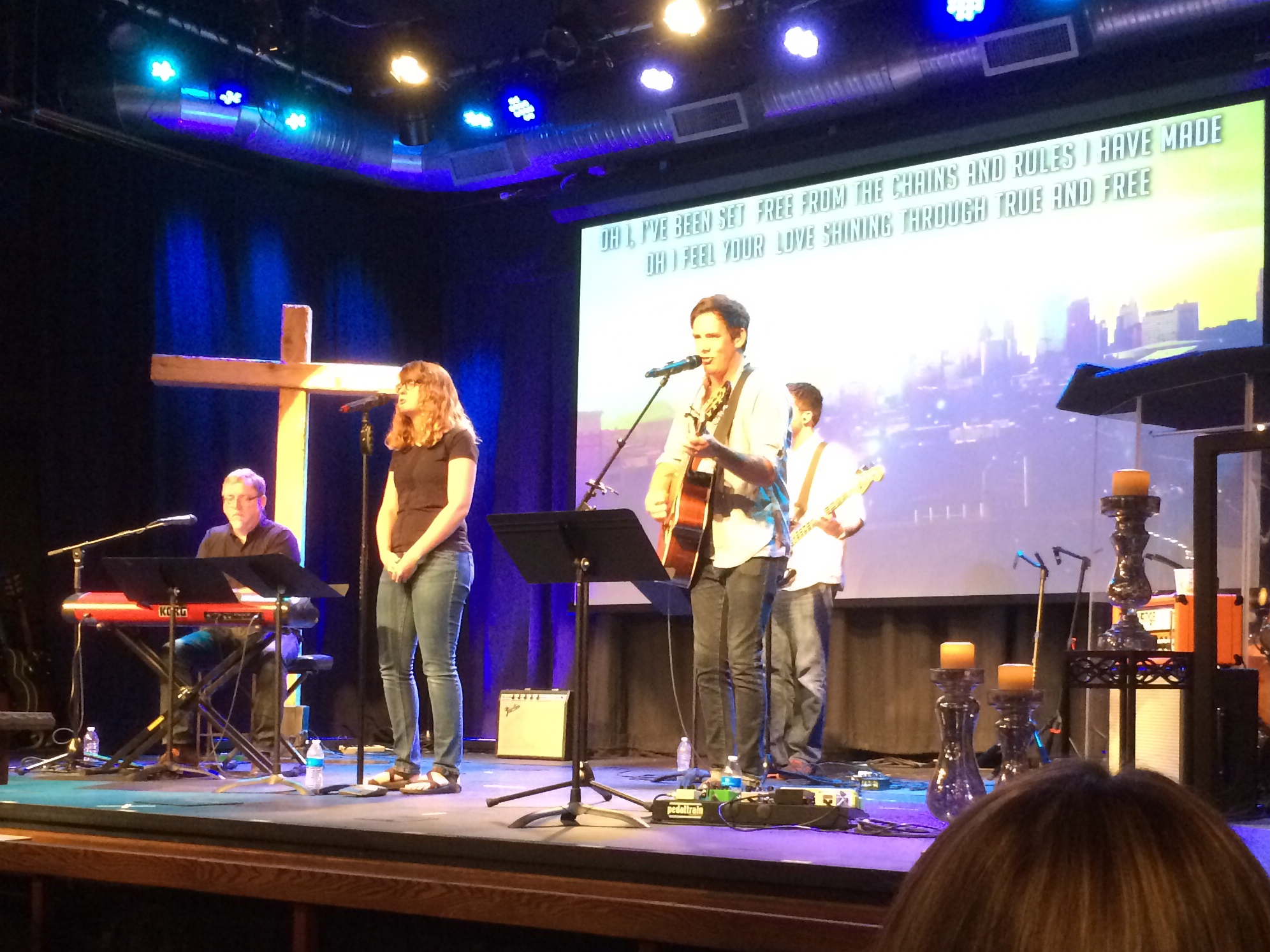 For about thirty minutes the worship band leads the congregation in song. The band is comprised of highly skilled and talented musicians. There are two electric guitarists; one of them controls the sequenced tracks. Then there is a drummer, a pianist, a bassist and the band leader sings and plays acoustic guitar. Five supporting vocalists complete the ensemble. The music is modern and anthemic, it reminds me a lot of the upbeat drone of bands like Edward Sharpe and the Magnetic Zeroes, Coldplay and classic U2. I’m particularly moved by a beautifully arranged interpretation of The Lord’s Prayer, which is modern yet tasteful.